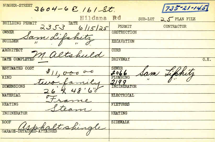 3606 Hildana Road Shaker Heights, OH 44120 PARCEL ID: 735-21-145 Building Permit Date: 06-15-1925 Plan File Number: 0 Neighborhood: Moreland Owner: Lifshitz, Sam Builder: Lifshitz, Sam Architect: Altshuld, M Estimated Cost: 11000 Kind: Duplex or Two-Family Material: Frame Heating: Steam Roof: Asphalt Shingles |