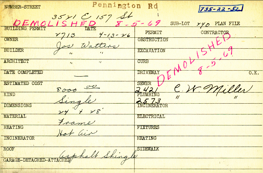 3521 Pennington Road Shaker Heights, OH 44120 PARCEL ID: 735-22-052 Building Permit Date: 04-13-1926 Plan File Number: 0 Neighborhood: Moreland Owner: Watters, Jos. Builder: Watters, Jos. Architect: Watters, Jos. Estimated Cost: 8000 Kind: Single, Single Residence or Dwelling Material: Frame Heating: Hot Air Roof: Shingles Card Available: Yes |  |
