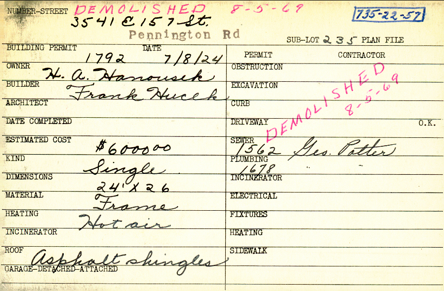3541 Pennington Road Shaker Heights, OH 44120 PARCEL ID: 735-22-057 Building Permit Date: 07-08-1924 Plan File Number: 0 Neighborhood: Moreland Owner: Hanousek, H. A. Builder: Hucek, Frank Estimated Cost: 6000 Kind: Single, Single Residence or Dwelling Material: Frame Heating: Hot Air Roof: Asphalt Shingles Card Available: Yes |  |