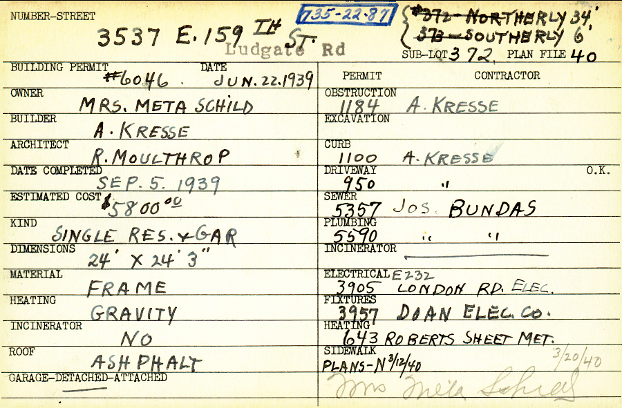 3537 Ludgate Road Shaker Heights, OH 44120 PARCEL ID: 735-22-087 Building Permit Date: 06-22-1939 Plan File Number: 40 Neighborhood: Moreland Owner: Schild, Mrs. Meta Builder: Kresse, A. Architect: Moulthrop, R. Estimated Cost: 5800 Date Completed: 09-05-1939 Kind: Single Dwelling and Garage Material: Frame Heating: Gravity System Roof: Asphalt Garage: detached Card Available: yes |