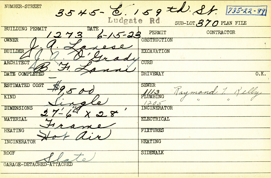 3545 Ludgate Road Shaker Heights, OH 44120 PARCEL ID: 735-22-089 Building Permit Date: 06-15-1923 Plan File Number: 0 Neighborhood: Moreland Owner: Lanese, J. A. Builder: O'Grady, J. A. Architect: Lanni, B. F. Estimated Cost: 9500 Kind: Single, Single Residence or Dwelling Material: Frame Heating: Hot Air Roof: Slate Card Available: yes |