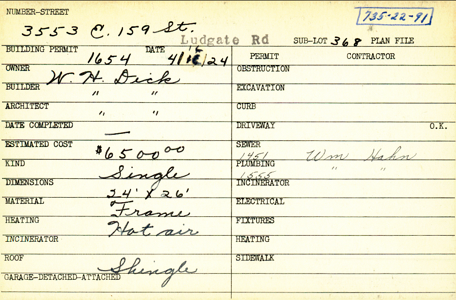 3553 Ludgate Road Shaker Heights, OH 44120 PARCEL ID: 735-22-091 Building Permit Date: 04-16-1924 Plan File Number: 0 Neighborhood: Moreland Owner: Dick, W. H. Builder: Dick, W. H. Architect: Dick, W. H. Estimated Cost: 6500 Kind: Single, Single Residence or Dwelling Material: Frame Heating: Hot Air Roof: Shingles Card Available: yes |