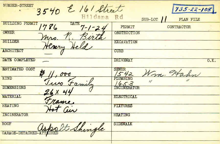 3540 Hildana Road Shaker Heights, OH 44120 PARCEL ID: 735-22-108 Building Permit Date: 07-01-1924 Plan File Number: 5789 Microfilm Roll: Roll#78 Neighborhood: Moreland Owner: Birth, Mrs. R. Builder: Held, Henry Estimated Cost: 11000 Kind: Duplex or Two-Family Material: Frame Heating: Hot Air Roof: Asphalt Shingles |