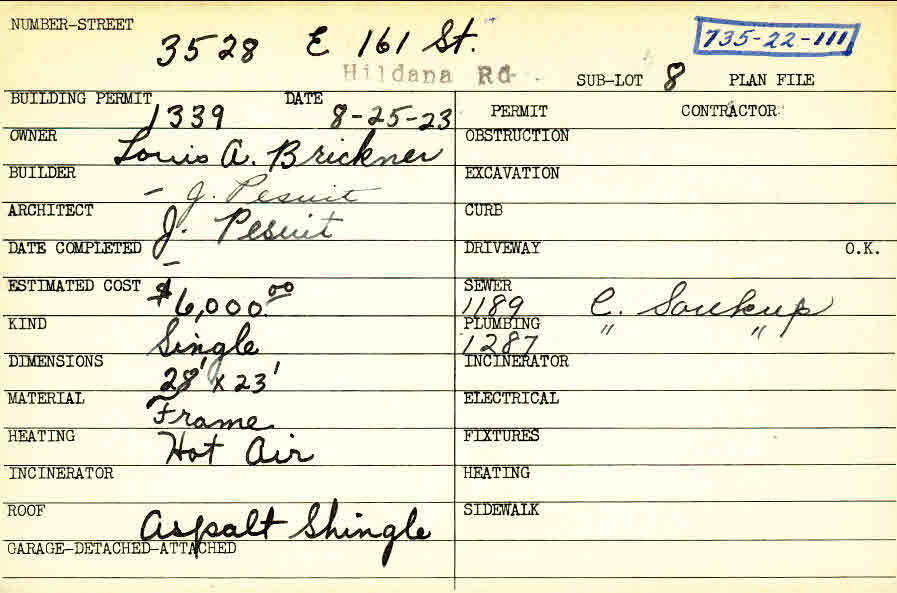 3528 Hildana Road Shaker Heights, OH 44120 PARCEL ID: 735-22-111 Building Permit Date: 08-25-1923 Plan File Number: 0 Neighborhood: Moreland Owner: Brickner, Louis A. Builder: Pesuit, J. Architect: Pesuit, J. Estimated Cost: 6000 Kind: Single, Single Residence or Dwelling Material: Frame Heating: Hot Air Roof: Asphalt Shingles Card Available: yes |