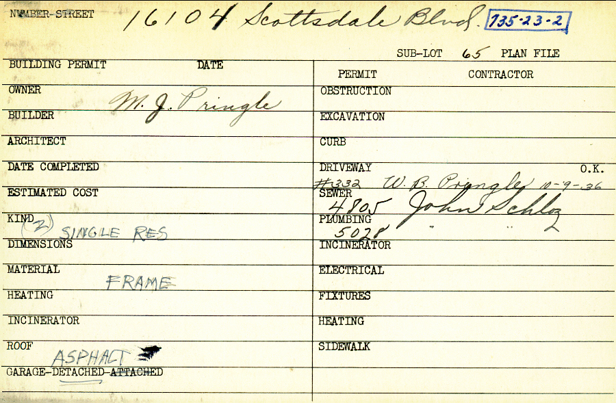 16104 Scottsdale Boulevard Shaker Heights, OH 44120 PARCEL ID: 735-23-002 Plan File Number: 2218 Microfilm Roll: Roll#33 Neighborhood: Moreland Owner: Pringle, M. J. Kind: Single, Single Residence or Dwelling (2) Material: Frame Roof: Asphalt Garage: detached |