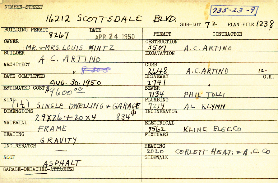 16212 Scottsdale Boulevard Shaker Heights, OH 44120 PARCEL ID: 735-23-009 Building Permit Date: 04-24-1950 Plan File Number: 1238 all scanned Microfilm Roll: Roll015 Owner: Mintz, Mr. and Mrs. Louis Builder: Artino, A. C. Architect: Artino, A. C. Estimated Cost: 9600 Date Completed: 08-30-1950 Kind: Single Dwelling and Garage Material: Frame Heating: Gravity System Roof: Asphalt Garage: detached |