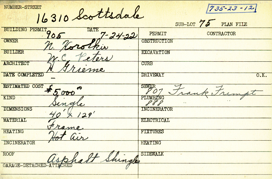 16310 Scottsdale Boulevard Shaker Heights, OH 44120 PARCEL ID: 735-23-012 Building Permit Date: 07-24-1922 Plan File Number: 0 Neighborhood: Moreland Owner: Korolkir, N. Builder: Peters, W. C. Architect: Grieme, H. Estimated Cost: 5000 Kind: Single, Single Residence or Dwelling Material: Frame Heating: Hot Air Roof: Asphalt Shingles |