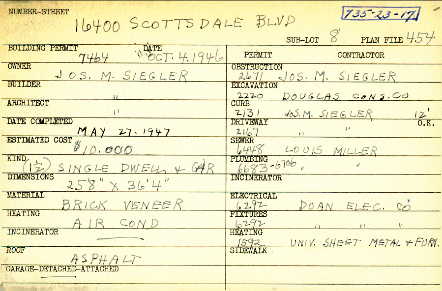 16400 Scottsdale Boulevard Shaker Heights, OH 44120 PARCEL ID: 735-23-017 Building Permit Date: 10-04-1946 Plan File Number: 454 scanned, 6824 Microfilm Roll: Roll004, Roll#88 Owner: Siegler, Joseph M. Builder: Siegler, Joseph M. Architect: Siegler, Joseph M. Estimated Cost: 10000 Date Completed: 05-27-1947 Kind: Single Dwelling and Garage Material: Brick Veneer Heating: Air Conditioned Roof: Asphalt Garage: detached |