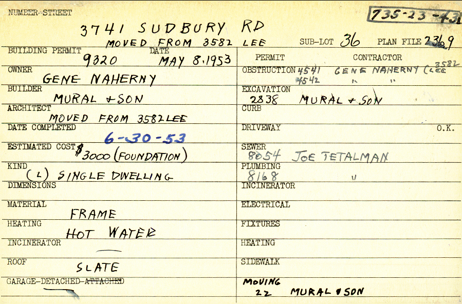 3741 Sudbury Road Shaker Heights, OH 44120 PARCEL ID: 735-23-043 Building Permit Date: 05-08-1953 Plan File Number: 2369, 4118 Microfilm Roll: Roll#34, Roll#60 Neighborhood: Moreland Owner: Naherny, Gene Builder: Mural and Son Estimated Cost: 3000 Date Completed: 06-30-1953 Kind: Single, Single Residence or Dwelling (2) Material: Frame Heating: Hot Water Roof: Slate Garage: detached |