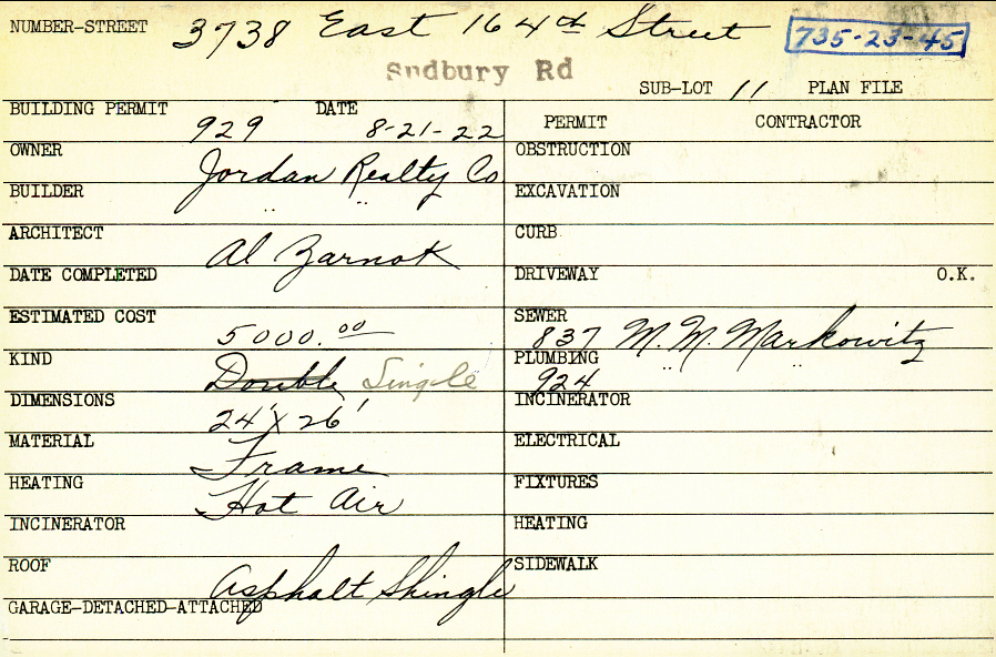 3738 Sudbury Road Shaker Heights, OH 44120 PARCEL ID: 735-23-045 Building Permit Date: 08-21-1922 Plan File Number: 4055 Microfilm Roll: Roll#59 Neighborhood: Moreland Owner: Jordon Realty Company Builder: Jordon Realty Company Architect: Zarnok, Al Estimated Cost: 5000 Kind: Single, Single Residence or Dwelling Material: Frame Heating: Hot Air Roof: Asphalt Shingles |