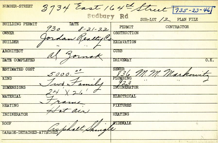 3734 Sudbury Road Shaker Heights, OH 44120 PARCEL ID: 735-23-046 Building Permit Date: 08-21-1922 Plan File Number: 0 Neighborhood: Moreland Owner: Jordan Realty Company Builder: Jordan Realty Company Architect: Zornok, Al Estimated Cost: 5000 Kind: Duplex or Two-Family Material: Frame Heating: Hot Air Roof: Asphalt Card Available: yes |