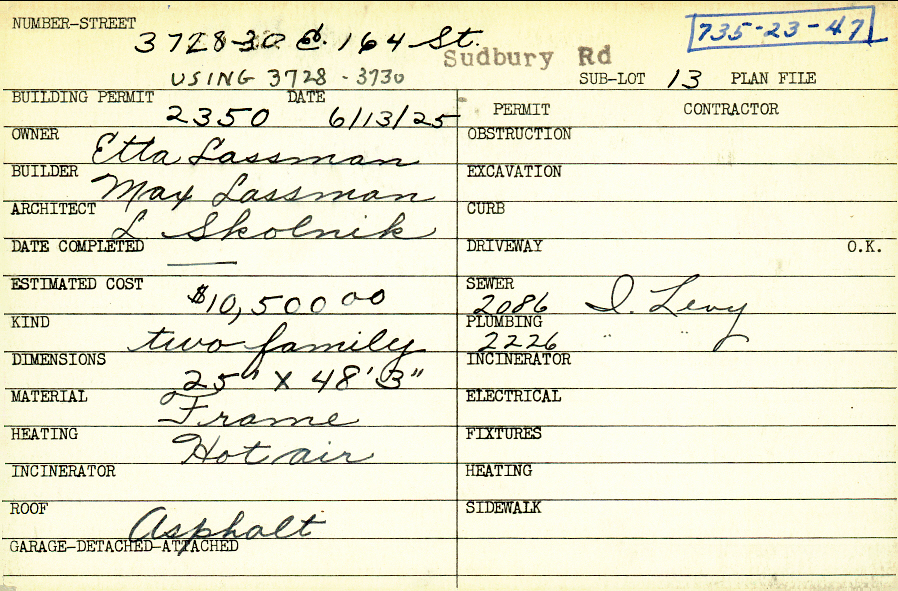 3728 Sudbury Road Shaker Heights, OH 44120 PARCEL ID: 735-23-047 Building Permit Date: 06-13-1925 Neighborhood: Moreland Owner: Lassman, Etta Builder: Lassman, Max Architect: Skolnik, Louis Estimated Cost: 10500 Kind: Duplex or Two-Family Material: Frame Heating: Hot Air Roof: Asphalt Blueprints: no blueprints on microfilm |