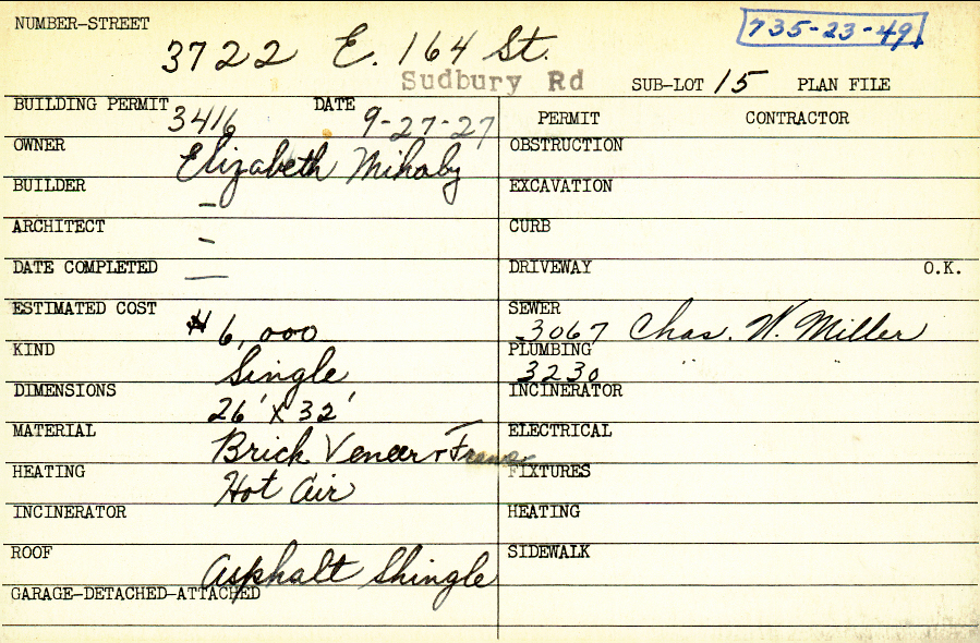 3722 Sudbury Road Shaker Heights, OH 44120 PARCEL ID: 735-23-049 Building Permit Date: 09-27-1927 Plan File Number: 0 Neighborhood: Moreland Owner: Mikaby,Elizabeth Estimated Cost: 6000 Kind: Single, Single Residence or Dwelling Material: Frame and Brick Veneer Heating: Hot Air Roof: Asphalt Shingles Card Available: yes |