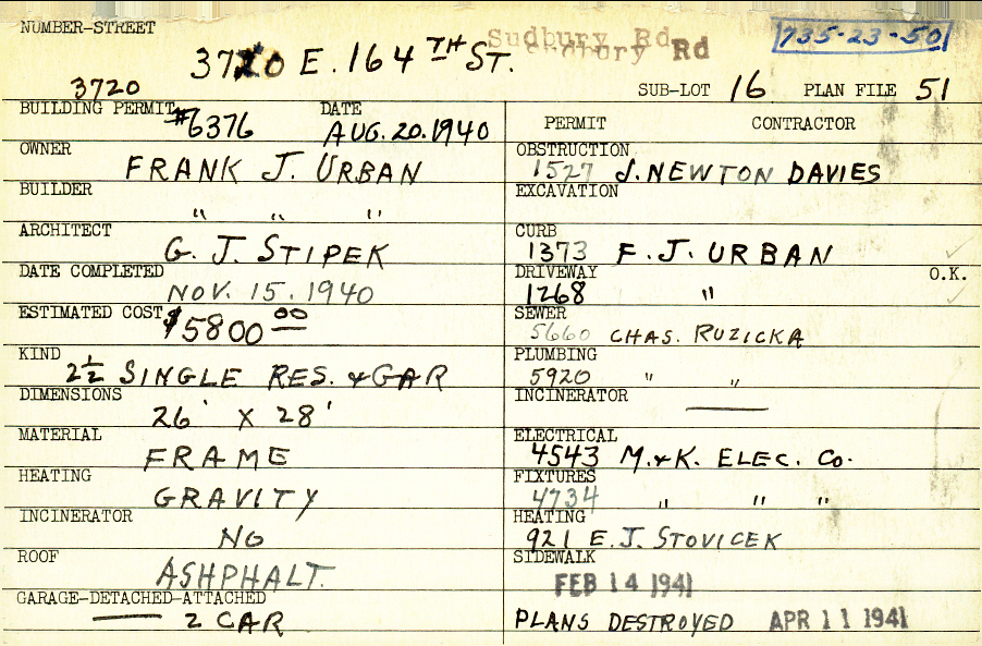 3720 Sudbury Road Shaker Heights, OH 44120 PARCEL ID: 735-23-050 Building Permit Date: 08-20-1940 Plan File Number: 51 Neighborhood: Moreland Owner: Urban Frank J. Builder: Urban Frank J. Architect: Stipek, G. J. Estimated Cost: 5800 Date Completed: 11-15-1940 Kind: Single 2-1/2 Material: Frame Heating: Gravity System Roof: Asphalt Garage: detached 2 car |