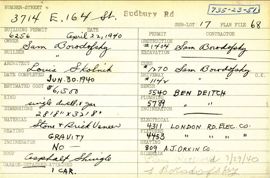 3714 Sudbury Road Shaker Heights, OH 44120 PARCEL ID: 735-23-051 Building Permit Date: 04-22-1940 Plan File Number: 68 Neighborhood: Moreland Owner: Borodofsky, Sam Builder: Borodofsky, Sam Architect: Skolnik, Louis Estimated Cost: 6500 Date Completed: 06-30-1940 Kind: Single Dwelling and Garage Material: Stone and Brick Veneer Heating: Gravity System Roof: Asphalt Shingles Garage: detached |