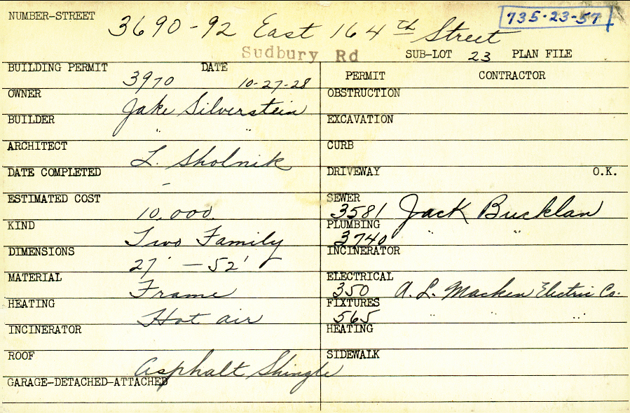 3690 Sudbury Road Shaker Heights, OH 44120 PARCEL ID: 735-23-057 Building Permit Date: 10-27-1928 Neighborhood: Moreland Owner: Silverstein, Jake Builder: Silverstein, Jake Architect: Skolnik, Louis Estimated Cost: 10000 Kind: Duplex or Two-Family Material: Frame Heating: Hot Air Roof: Asphalt Shingles Blueprints: no blueprints on microfilm |