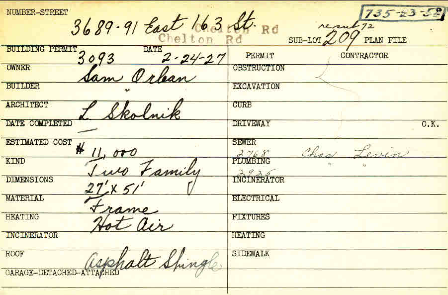 3689 Chelton Road Shaker Heights, OH 44120 PARCEL ID: 735-23-058 Building Permit Date: 02-24-1927 Plan File Number: 4051 Microfilm Roll: Roll#59 Neighborhood: Moreland Owner: Orlean, Sam Builder: Orlean, Sam Architect: Skolnik, Louis Estimated Cost: 11000 Kind: Duplex or Two-Family Material: Frame Heating: Hot Air Roof: Asphalt Shingles |