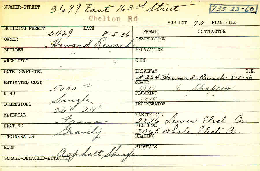3699 Chelton Road Shaker Heights, OH 44120 PARCEL ID: 735-23-060 Building Permit Date: 08-05-1936 Plan File Number: 907 scanned, 6026 Microfilm Roll: Roll012, Roll#80 Neighborhood: Moreland Owner: Reusch, Howard Builder: Reusch, Howard Architect: Reusch, Howard Estimated Cost: 5000 Kind: Single, Single Residence or Dwelling Material: Frame Heating: Gravity System Roof: Asphalt Shingles |