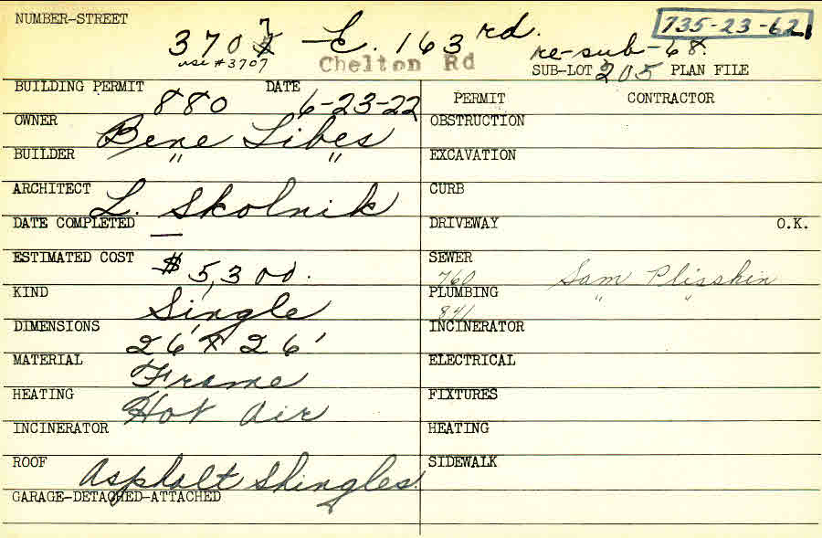 3707 Chelton Road Shaker Heights, OH 44120 PARCEL ID: 735-23-062 Building Permit Date: 06-23-1922 Plan File Number: 6672 Microfilm Roll: Roll#87 Neighborhood: Moreland Owner: Libes, Bene Builder: Libes, Bene Architect: Skolnik, Louis Estimated Cost: 5300 Kind: Single, Single Residence or Dwelling Material: Frame Heating: Hot Air Roof: Asphalt Shingles |