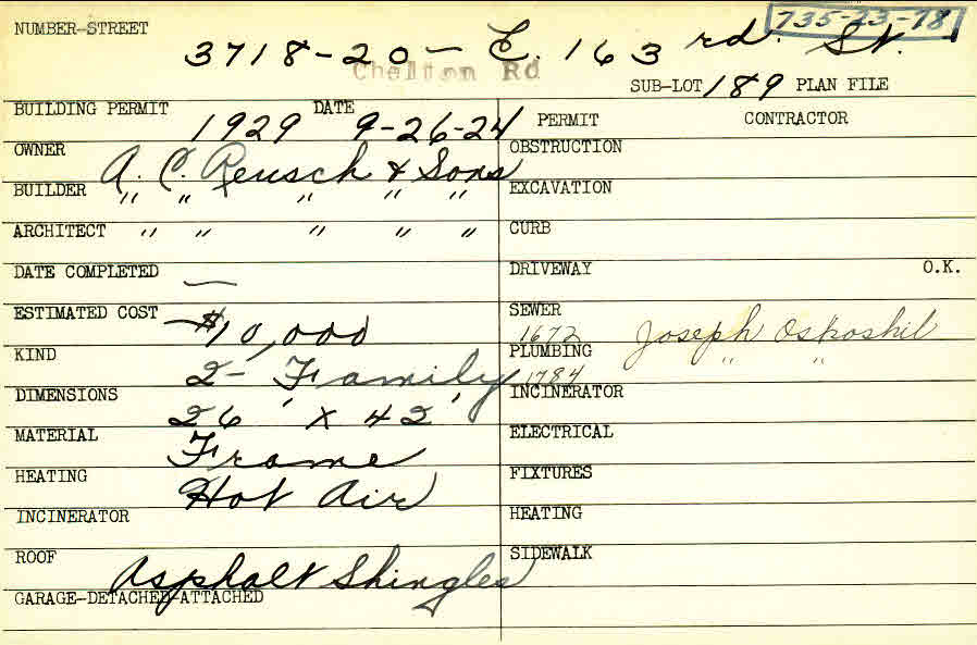 3718 Chelton Road Shaker Heights, OH 44120 PARCEL ID: 735-23-078 Building Permit Date: 09-26-1924 Plan File Number: 0 Neighborhood: Moreland Owner: A. C. Reusch and Sons Builder: A. C. Reusch and Sons Architect: A. C. Reusch and Sons Estimated Cost: 10000 Kind: Duplex or Two-Family Material: Frame Heating: Hot Air Roof: Asphalt Shingles Card Available: yes |