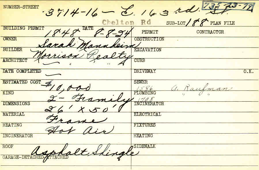 3714 Chelton Road Shaker Heights, OH 44120 PARCEL ID: 735-23-079 Building Permit Date: 08-08-1924 Plan File Number: 7603 Microfilm Roll: Roll#93 Neighborhood: Moreland Owner: Mannheim, Sarah Builder: Morrison Realty Architect: Morrison Realty Estimated Cost: 10000 Kind: Duplex or Two-Family Material: Frame Heating: Hot Air Roof: Asphalt Shingles |
