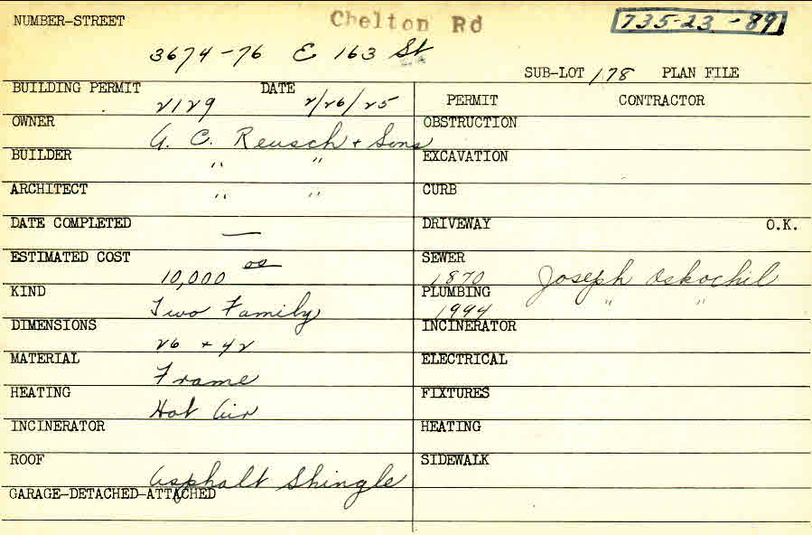 3674 Chelton Road Shaker Heights, OH 44120 PARCEL ID: 735-23-089 Building Permit Date: 02-26-1925 Plan File Number: 0 Neighborhood: Moreland Owner: A. C. Reusch and Sons Builder: A. C. Reusch and Sons Architect: A. C. Reusch and Sons Estimated Cost: 10000 Kind: Duplex or Two-Family Material: Frame Heating: Hot Air Roof: Asphalt Shingles Card Available: yes |