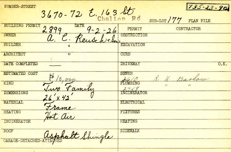 3670 Chelton Road Shaker Heights, OH 44120 PARCEL ID: 735-23-090 Building Permit Date: 09-02-1926 Plan File Number: 0 Neighborhood: Moreland Owner: A. C. Reusch and Sons Builder: A. C. Reusch and Sons Architect: A. C. Reusch and Sons Estimated Cost: 10000 Kind: Duplex or Two-Family Material: Frame Heating: Hot Air Roof: Asphalt Shingles Card Available: yes |