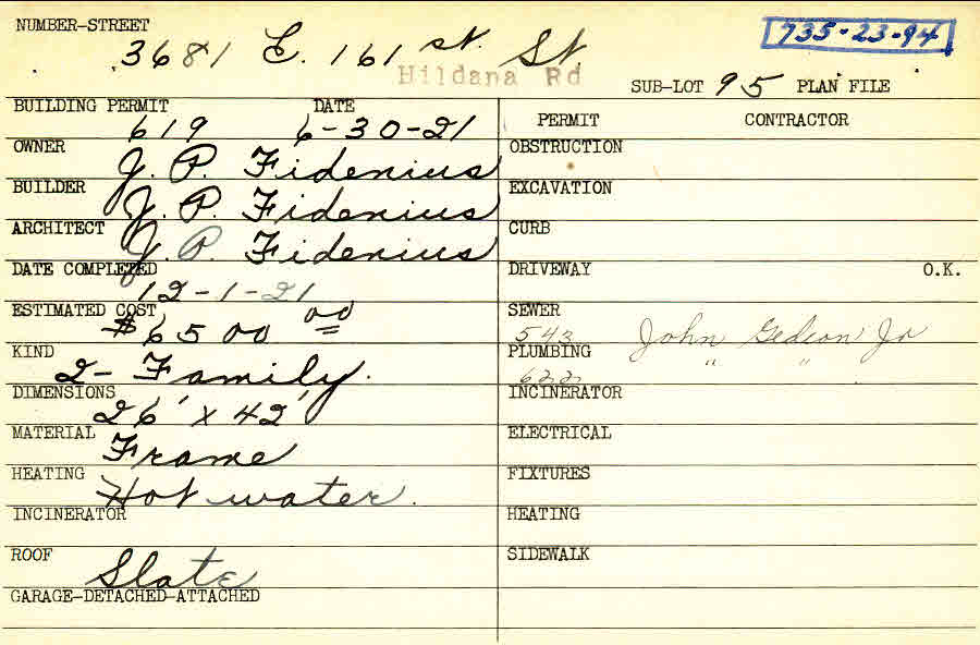 3681 Hildana Road Shaker Heights, OH 44120 PARCEL ID: 735-23-094 Building Permit Date: 06-30-1921 Plan File Number: 0 Neighborhood: Moreland Owner: Fidenius, J. P. Builder: Fidenius, J. P. Architect: Fidenius, J. P. Estimated Cost: 6500 Date Completed: 12-01-1921 Kind: Duplex or Two-Family Material: Frame Heating: Hot Water Roof: Slate Card Available: yes |