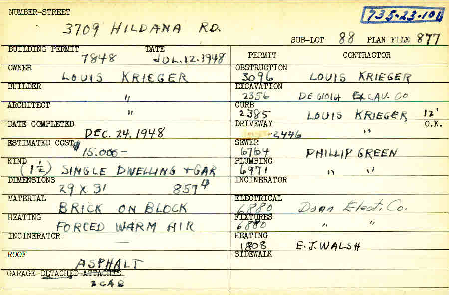 3709 Hildana Road Shaker Heights, OH 44120 PARCEL ID: 735-23-101 Building Permit Date: 07-12-1948 Plan File Number: 877 all scanned Microfilm Roll: Roll011 Neighborhood: Moreland Owner: Krieger, Louis Builder: Krieger, Louis Architect: Krieger, Louis Estimated Cost: 15000 Date Completed: 12-24-1948 Kind: Single Dwelling and Garage Material: Brick on Block Heating: Forced Air Roof: Asphalt Garage: detached 2 car |