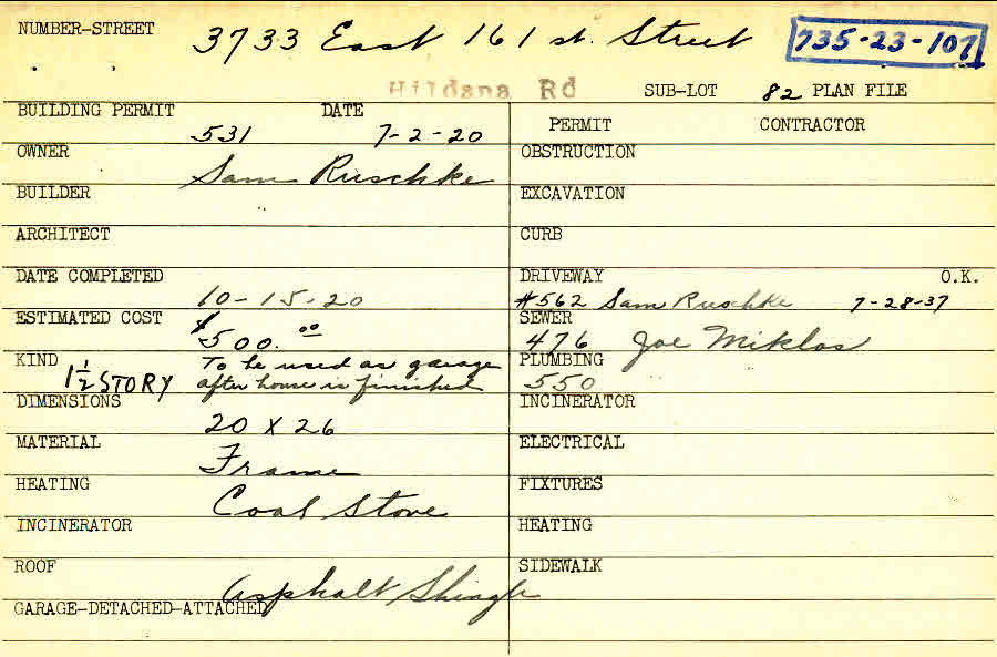 3733 Hildana Road Shaker Heights, OH 44120 PARCEL ID: 735-23-107 Building Permit Date: 07-02-1920 Plan File Number: 0 Neighborhood: Moreland Owner: Ruschke, Sam Builder: Ruschke, Sam Estimated Cost: 500 Date Completed: 10-15-1920 Material: Frame Roof: Asphalt Shingles |