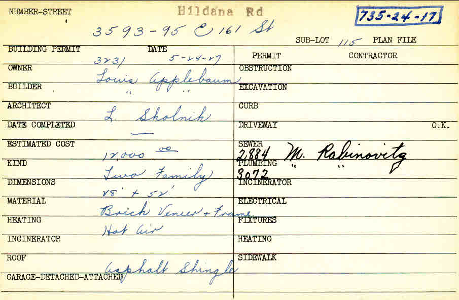 3593 Hildana Road Shaker Heights, OH 44120 PARCEL ID: 735-24-017 Building Permit Date: 05-24-1927 Neighborhood: Moreland Owner: Applebaum, Louis Builder: Applebaum, Louis Architect: Skolnik, Louis Estimated Cost: 12000 Kind: Duplex or Two-Family Material: Brick Veneer and Frame Heating: Hot Air Roof: Asphalt Shingles Blueprints: no blueprints on microfilm |