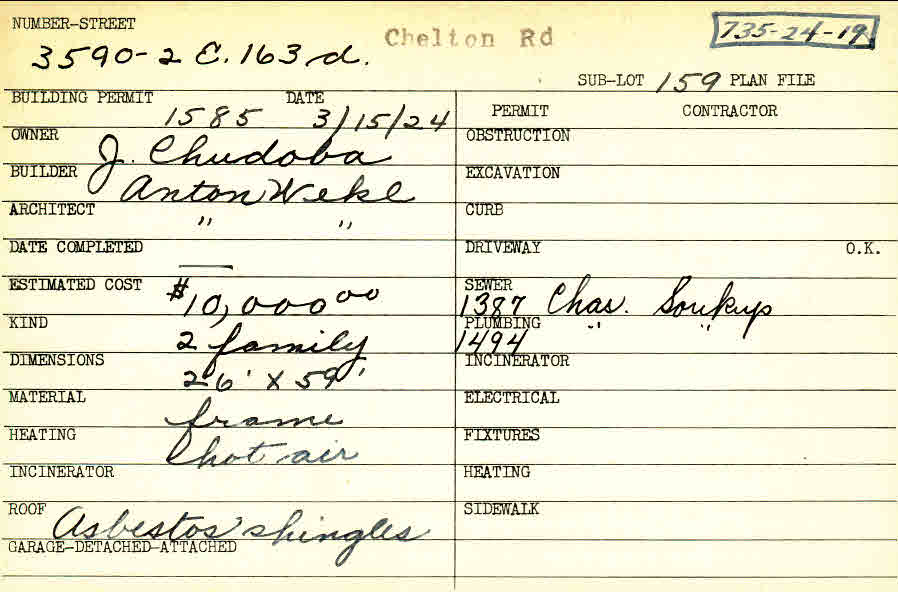 3590 Chelton Road Shaker Heights, OH 44120 PARCEL ID: 735-24-019 Building Permit Date: 03-15-1924 Plan File Number: 0 Neighborhood: Moreland Owner: Chudoba, J. Builder: Wekl, Anton Architect: Wekl, Anton Estimated Cost: 10000 Kind: Duplex or Two-Family Material: Frame Heating: Hot Air Roof: Asphalt Shingles Card Available: yes |