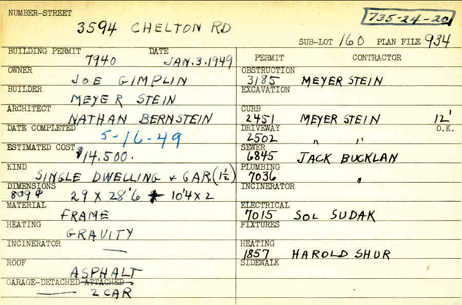 3594 Chelton Road Shaker Heights, OH 44120 PARCEL ID: 735-24-020 Building Permit Date: 01-03-1949 Plan File Number: 934 all scanned Microfilm Roll: Roll012 Neighborhood: Moreland Owner: Gimplin, Joe Builder: Stein, Meyer Architect: Bernstein, Nathan Estimated Cost: 14500 Date Completed: 05-16-1949 Kind: Single Dwelling and Garage Material: Frame Heating: Gravity System Roof: Asphalt Garage: detached 2 car |