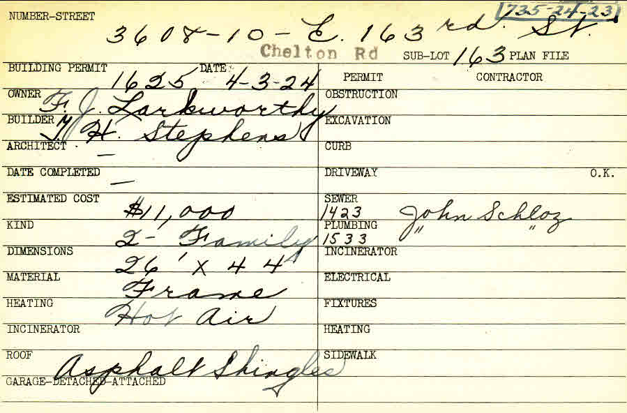 3608 Chelton Road Shaker Heights, OH 44120 PARCEL ID: 735-24-023 Building Permit Date: 04-03-1924 Plan File Number: 0 Neighborhood: Moreland Owner: Larkworthy, F. J. Builder: Stephens, T. H. Estimated Cost: 11000 Kind: Duplex or Two-Family Material: Frame Heating: Hot Air Roof: Asphalt Shingles Card Available: yes |