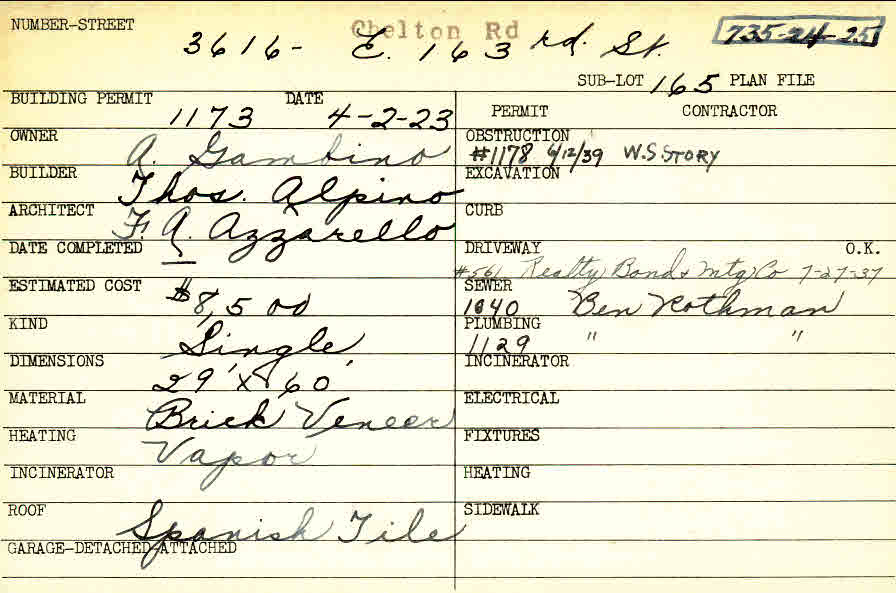 3616 Chelton Road Shaker Heights, OH 44120 PARCEL ID: 735-24-025 Building Permit Date: 04-02-1923 Plan File Number: 0 Neighborhood: Moreland Owner: Gambino, A. Builder: Alpino, Thomas Architect: Azzarello, F. A. Estimated Cost: 8500 Kind: Single, Single Residence or Dwelling Material: Brick Veneer Heating: Vapor Roof: Tile Card Available: yes |