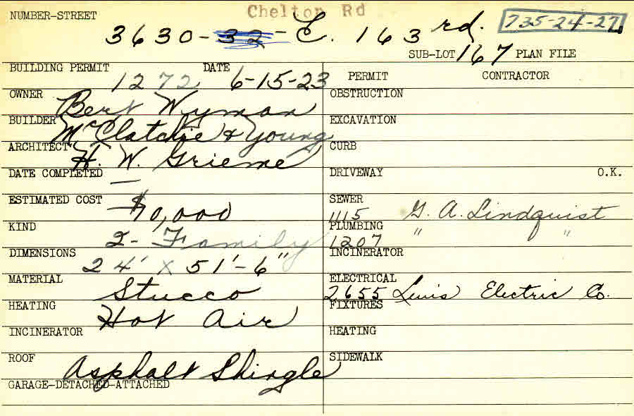 3630 Chelton Road Shaker Heights, OH 44120 PARCEL ID: 735-24-027 Building Permit Date: 06-15-1923 Plan File Number: 3661 Microfilm Roll: Roll#54 Neighborhood: Moreland Owner: Wyman, Bert Builder: McClatchie and Young Architect: Grieme, H. W. Estimated Cost: 10000 Kind: Duplex or Two-Family Material: Stucco Heating: Hot Air Roof: Asphalt Shingles |