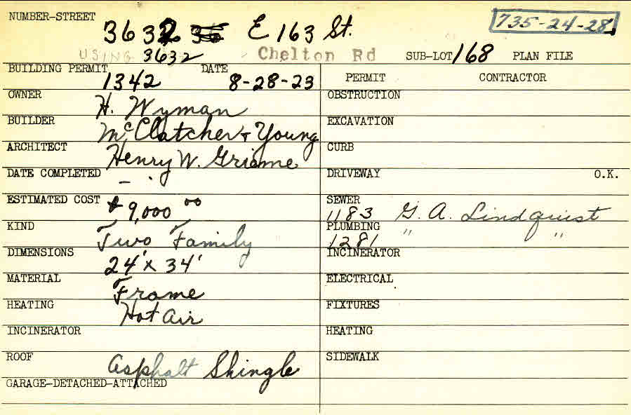 3632 Chelton Road Shaker Heights, OH 44120 PARCEL ID: 735-24-028 Building Permit Date: 08-28-1923 Plan File Number: 0 Neighborhood: Moreland Owner: Wyman, H. Builder: McClatcher and Young Architect: Grieme, Henry W. Estimated Cost: 9000 Kind: Duplex or Two-Family Material: Frame Heating: Hot Air Roof: Asphalt Shingles Card Available: yes |