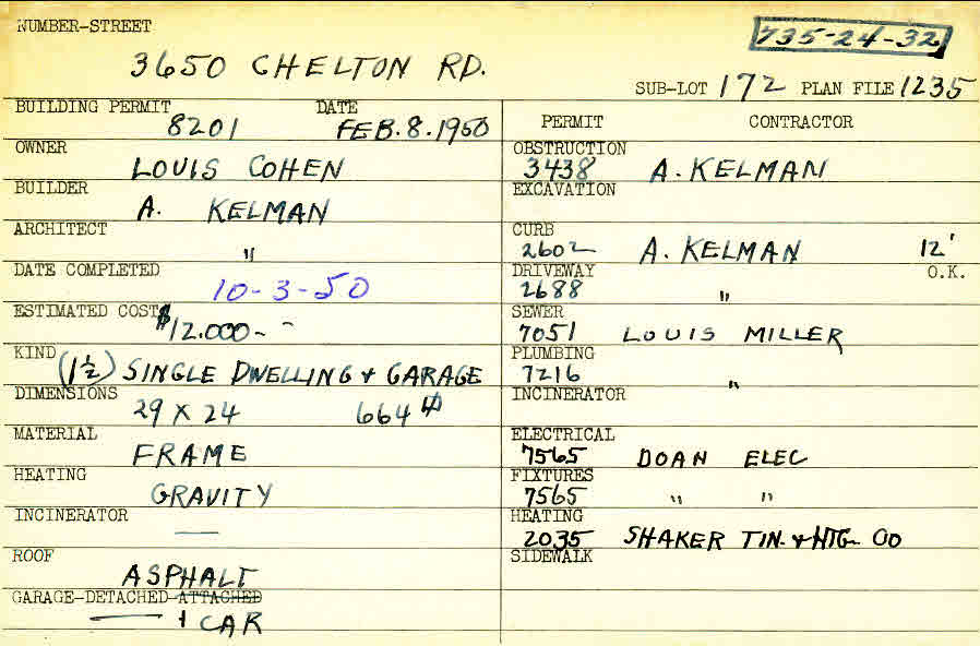 3650 Chelton Road Shaker Heights, OH 44120 PARCEL ID: 735-24-032 Building Permit Date: 02-08-1950 Plan File Number: 1235 all scanned Microfilm Roll: Roll015 Neighborhood: Moreland Owner: Cohen, Louis Builder: Kelman, A. Architect: Kelman, A. Estimated Cost: 12000 Date Completed: 10-03-1950 Kind: Single Dwelling and Garage Material: Frame Heating: Gravity System Roof: Asphalt Garage: detached |