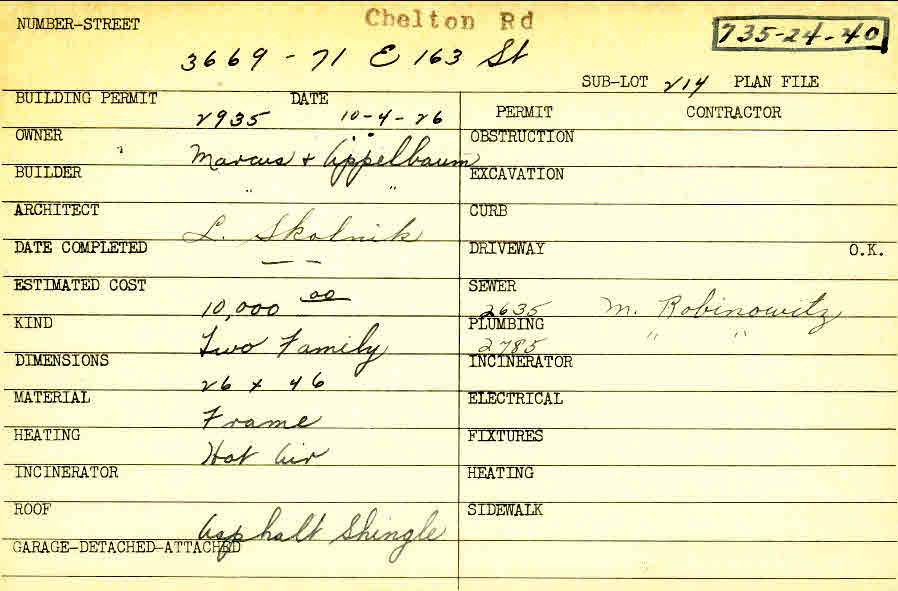 3669 Chelton Road Shaker Heights, OH 44120 PARCEL ID: 735-24-040 Building Permit Date: 10-04-1926 Neighborhood: Moreland Owner: Marcus and Appelbaum Builder: Marcus and Appelbaum Architect: Skolnik, Louis Estimated Cost: 10000 Kind: Duplex or Two-Family Material: Frame Heating: Hot Air Roof: Asphalt Shingles Blueprints: no blueprints on microfilm |