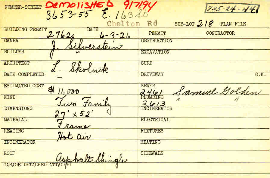 3653 Chelton Road Shaker Heights, OH 44120 PARCEL ID: 735-24-044 Building Permit Date: 06-03-1926 Plan File Number: 4876 Microfilm Roll: Roll#67 Neighborhood: Moreland Owner: Silverstein, J. Builder: Silverstein, J. Architect: Skolnik, Louis Estimated Cost: 11000 Kind: Duplex or Two-Family Material: Frame Heating: Hot Air Roof: Asphalt Shingles |