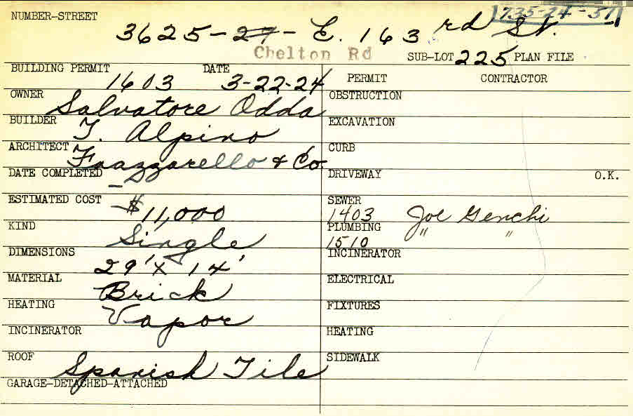 3625 Chelton Road Shaker Heights, OH 44120 PARCEL ID: 735-24-051 Building Permit Date: 03-22-1924 Plan File Number: 0 Neighborhood: Moreland Owner: Odda, Salvatore Builder: Alpino, T. Architect: Frazzarello and Company Estimated Cost: 11000 Kind: Single, Single Residence or Dwelling Material: Brick Heating: Vapor Roof: Tile Card Available: yes |