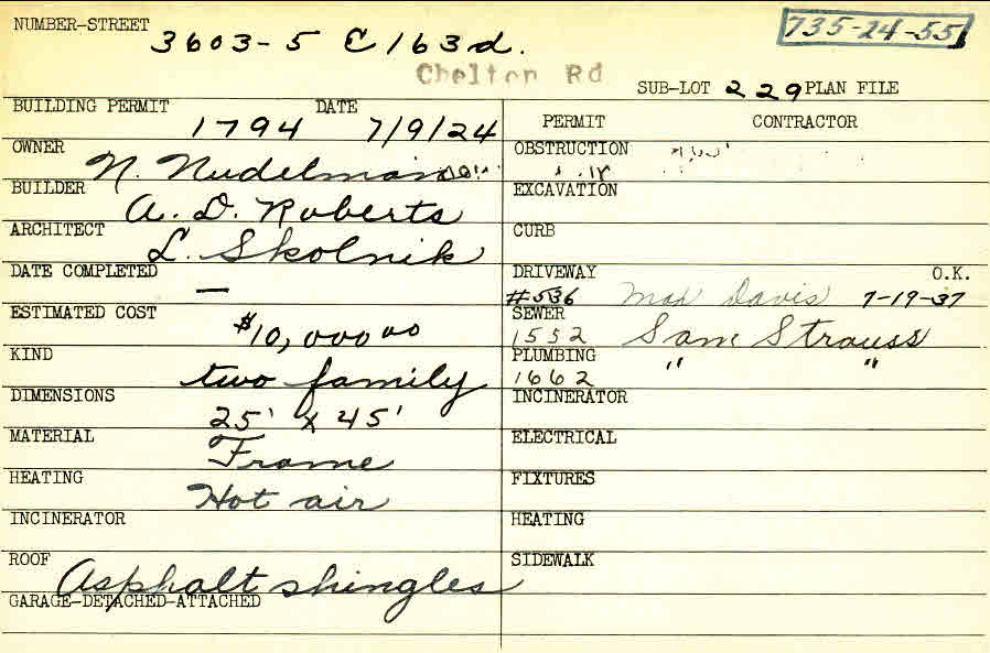 3603 Chelton Road Shaker Heights, OH 44120 PARCEL ID: 735-24-055 Building Permit Date: 07-09-1924 Plan File Number: 7001 Microfilm Roll: Roll#90 Neighborhood: Moreland Owner: Nudelman, N. Builder: Roberts, A. D. Architect: Skolnik, Louis Estimated Cost: 10000 Kind: Duplex or Two-Family Material: Frame Heating: Hot Air Roof: Asphalt Shingles |