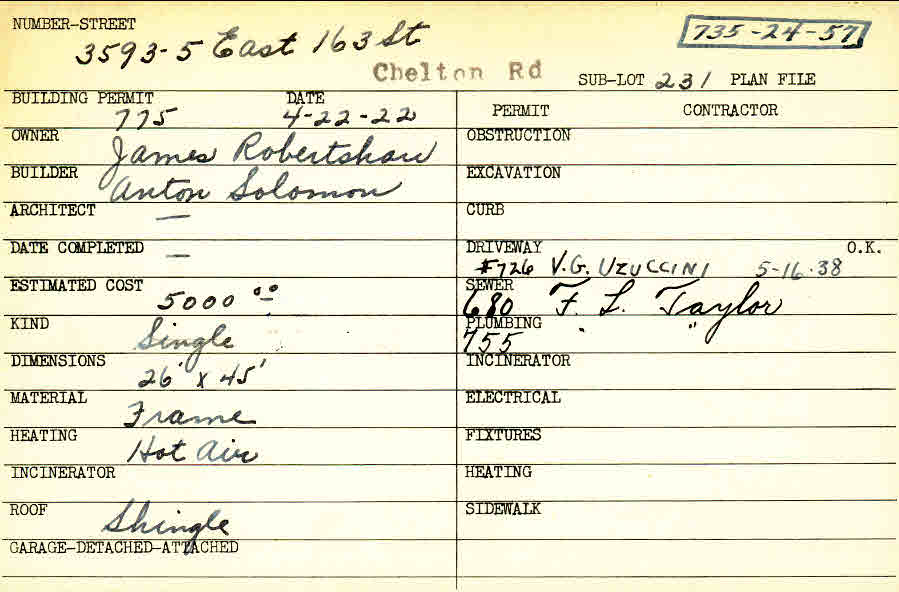 3593 Chelton Road Shaker Heights, OH 44120 PARCEL ID: 735-24-057 Building Permit Date: 04-22-1922 Plan File Number: 10261 Microfilm Roll: NewRoll#3 Neighborhood: Moreland Owner: Robertshau, James Builder: Solomon, Anton Estimated Cost: 5000 Kind: Single, Single Residence or Dwelling Material: Frame Heating: Hot Air Roof: Shingles |