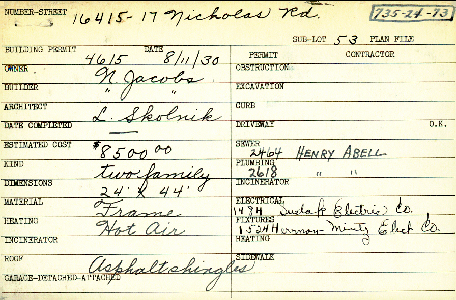 16415 Nicholas Road Shaker Heights, OH 44120 PARCEL ID: 735-24-073 Building Permit Date: 08-11-1930 Neighborhood: Moreland Owner: Jacobs, N. Builder: Jacobs, N. Architect: Skolnik, Louis Estimated Cost: 8500 Kind: Duplex or Two-Family Material: Frame Heating: Hot Air Roof: Asphalt Shingles Blueprints: no blueprints on microfilm |