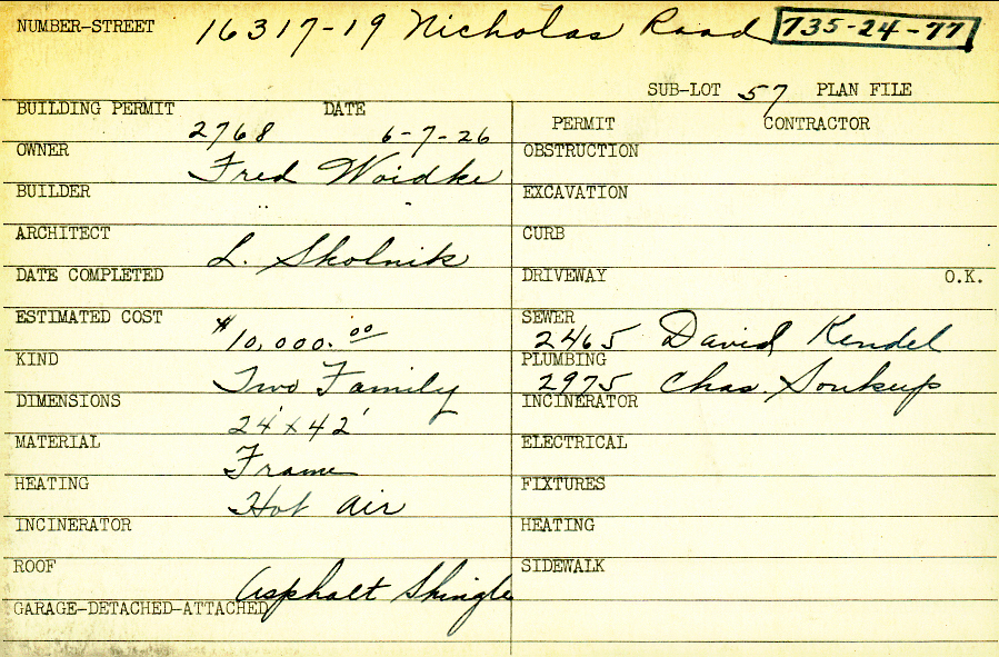 16317 Nicholas Road Shaker Heights, OH 44120 PARCEL ID: 735-24-077 Building Permit Date: 06-07-1926 Plan File Number: 6288 Microfilm Roll: Roll#84 Neighborhood: Moreland Owner: Woidke, Fred Builder: Woidke, Fred Architect: Skolnik, Louis Estimated Cost: 10000 Kind: Duplex or Two-Family Material: Frame Heating: Hot Air Roof: Asphalt Shingles |