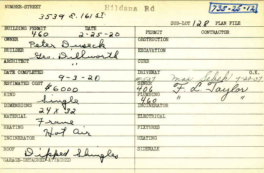 3539 Hildana Road Shaker Heights, OH 44120 PARCEL ID: 735-25-012 Building Permit Date: 02-25-1920 Plan File Number: 0 Neighborhood: Moreland Owner: Duseck, Peter Builder: Dillworth, George Architect: Dillworth, George Estimated Cost: 6000 Date Completed: 09-03-1920 Kind: Single, Single Residence or Dwelling Material: Frame Heating: Hot Air Roof: Shingles |