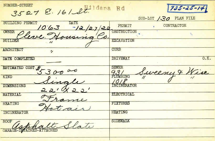 3527 Hildana Road Shaker Heights, OH 44120 PARCEL ID: 735-25-014 Building Permit Date: 12-27-1922 Plan File Number: 6072 Microfilm Roll: Roll#81 Neighborhood: Moreland Owner: Cleveland Housing Company Builder: Cleveland Housing Company Architect: Cleveland Housing Company Estimated Cost: 5300 Kind: Single, Single Residence or Dwelling Material: Frame Heating: Hot Air Roof: Asphalt |