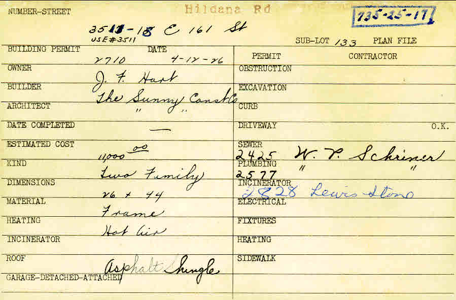 3511 Hildana Road Shaker Heights, OH 44120 PARCEL ID: 735-25-017 Building Permit Date: 04-12-1926 Plan File Number: 0 Neighborhood: Moreland Owner: Hart, J. F. Builder: The Sunny Construction Company Architect: The Sunny Construction Company Estimated Cost: 11000 Kind: Duplex or Two-Family Material: Frame Heating: Hot Air Roof: Asphalt Shingles |
