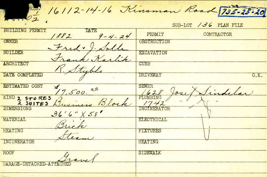 16112 Chagrin Boulevard Shaker Heights, OH 44120 PARCEL ID: 735-25-020 Building Permit Date: 09-04-1924 Plan File Number: 544 scanned Microfilm Roll: Roll007 Neighborhood: Moreland Owner: Solle, Fred and J. Builder: Karlik, Frank Architect: Styblo, R. Estimated Cost: 17500 Kind: Commercial - Retail or Office Material: Brick Heating: Steam |