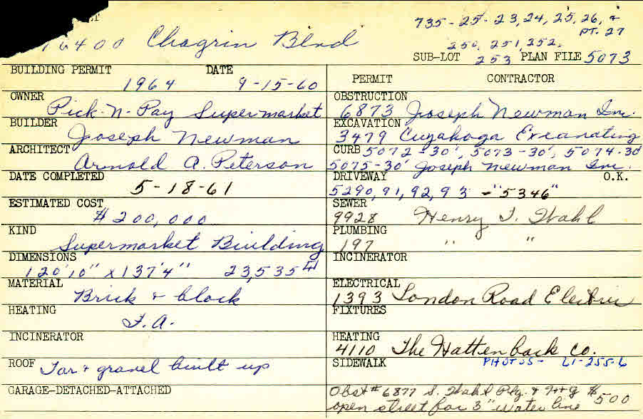 16400 Chagrin Boulevard Shaker Heights, OH 44120 PARCEL ID: 735-25-023 Building Permit Date: 09-15-1960 Plan File Number: 5073, 5253, 5320, 5321, 5923, 7864, 12922 scanned, 13053-13060 scanned, 13099-13100 scanned Microfilm Roll: Roll#69, Roll#72, Roll#73, Roll#80, Roll#95, NewRoll19 Neighborhood: Moreland Owner: Pick-N-Pay Supermarket Builder: Newman, Joseph Architect: Peterson, Arnold A. Estimated Cost: 200000 Date Completed: 05-18-1961 Kind: Commercial - Retail or Office Material: Brick & Block Heating: Forced Air |